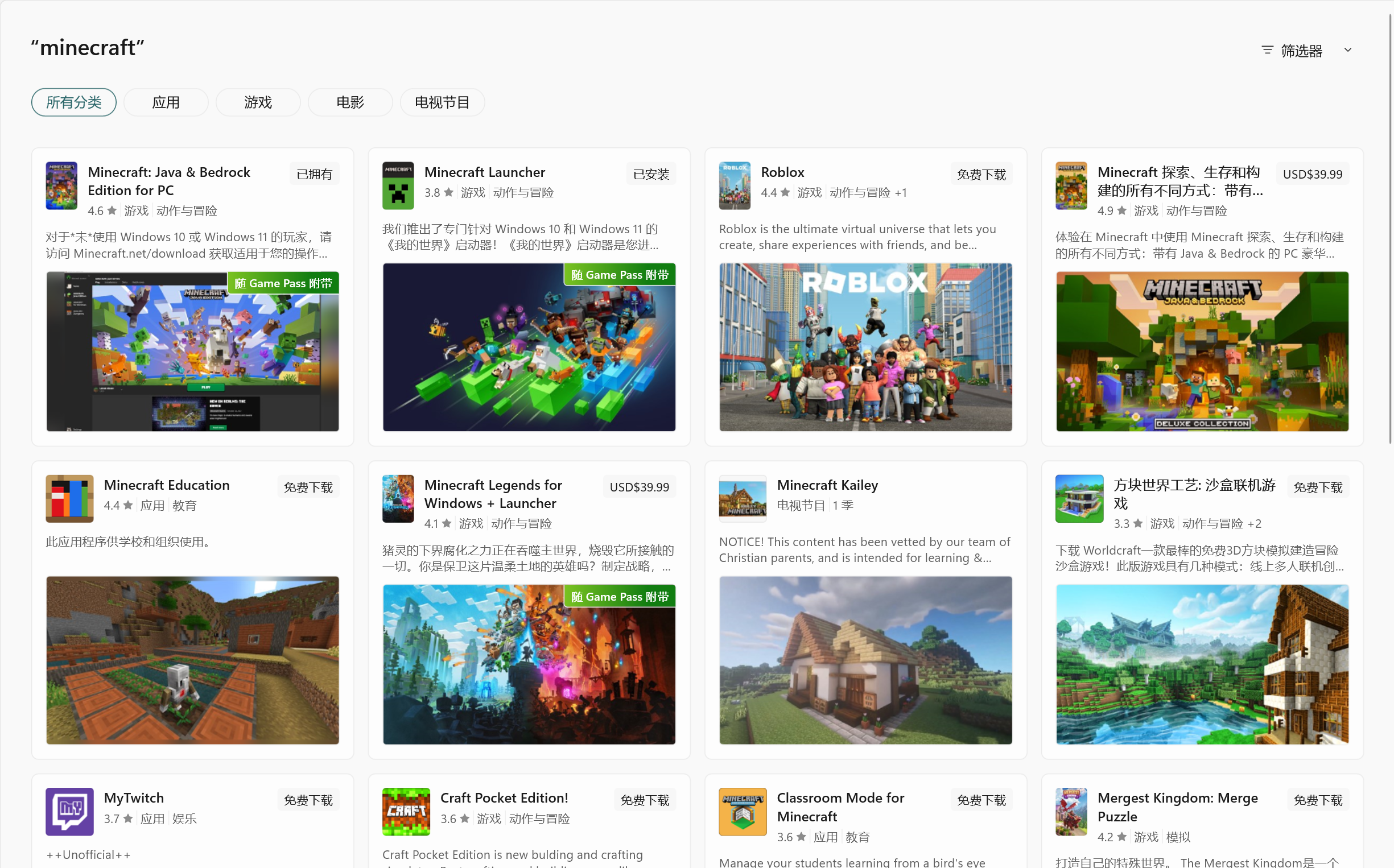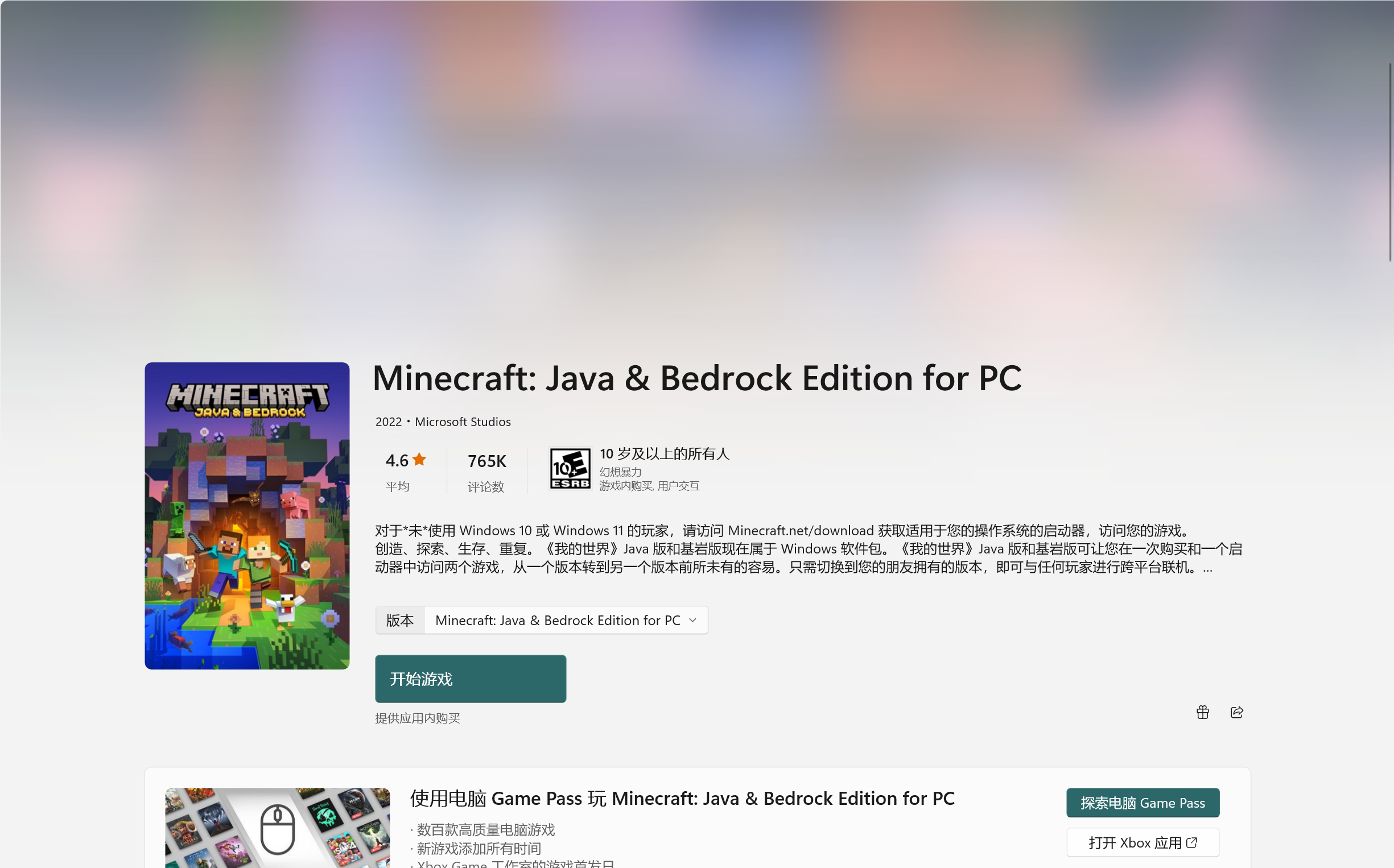 在搜索结果中找到[Minecraft: Java & Bedrock Edition for PC], 点击进入, 在应用详情页内选择购买, 如图所示.