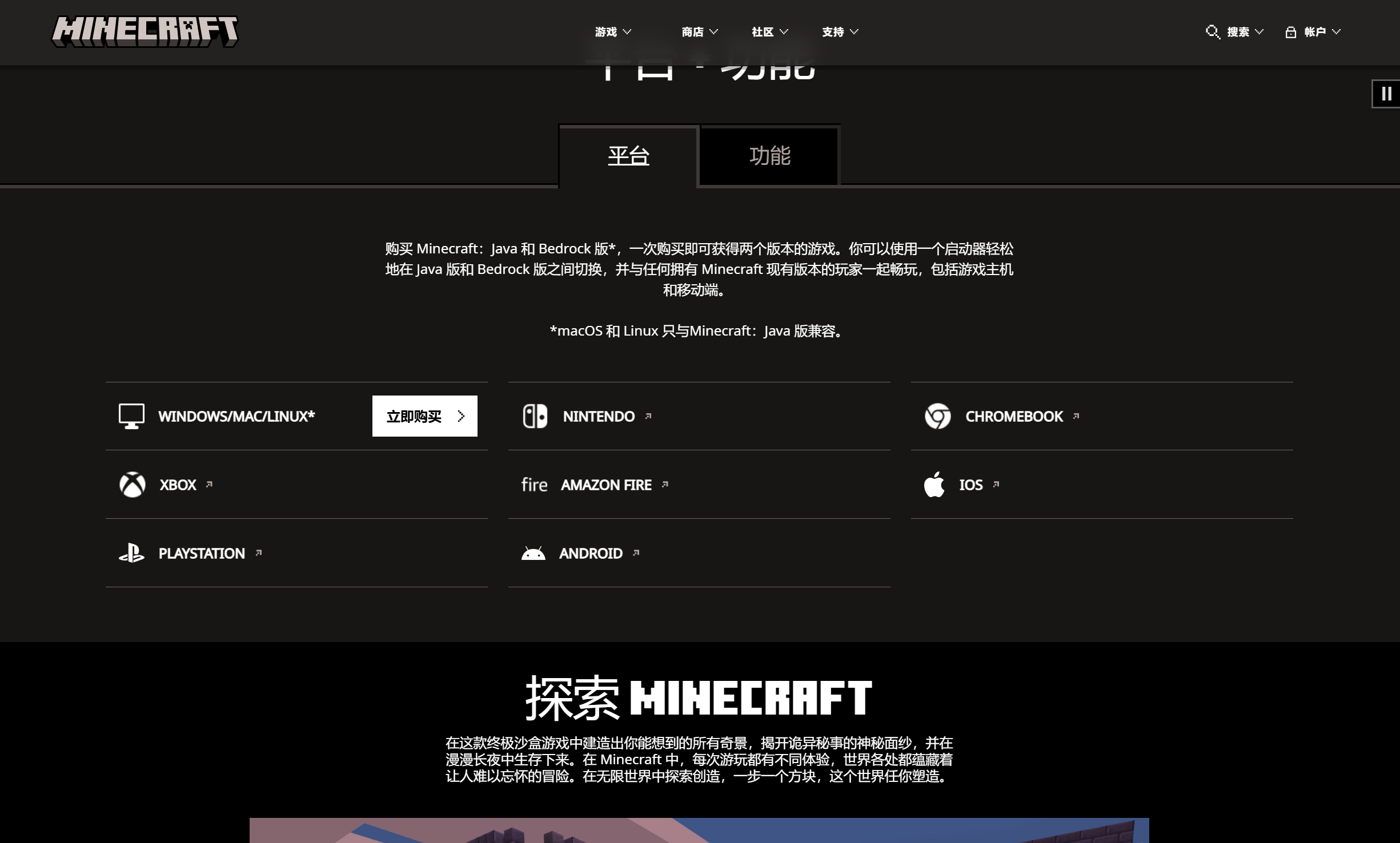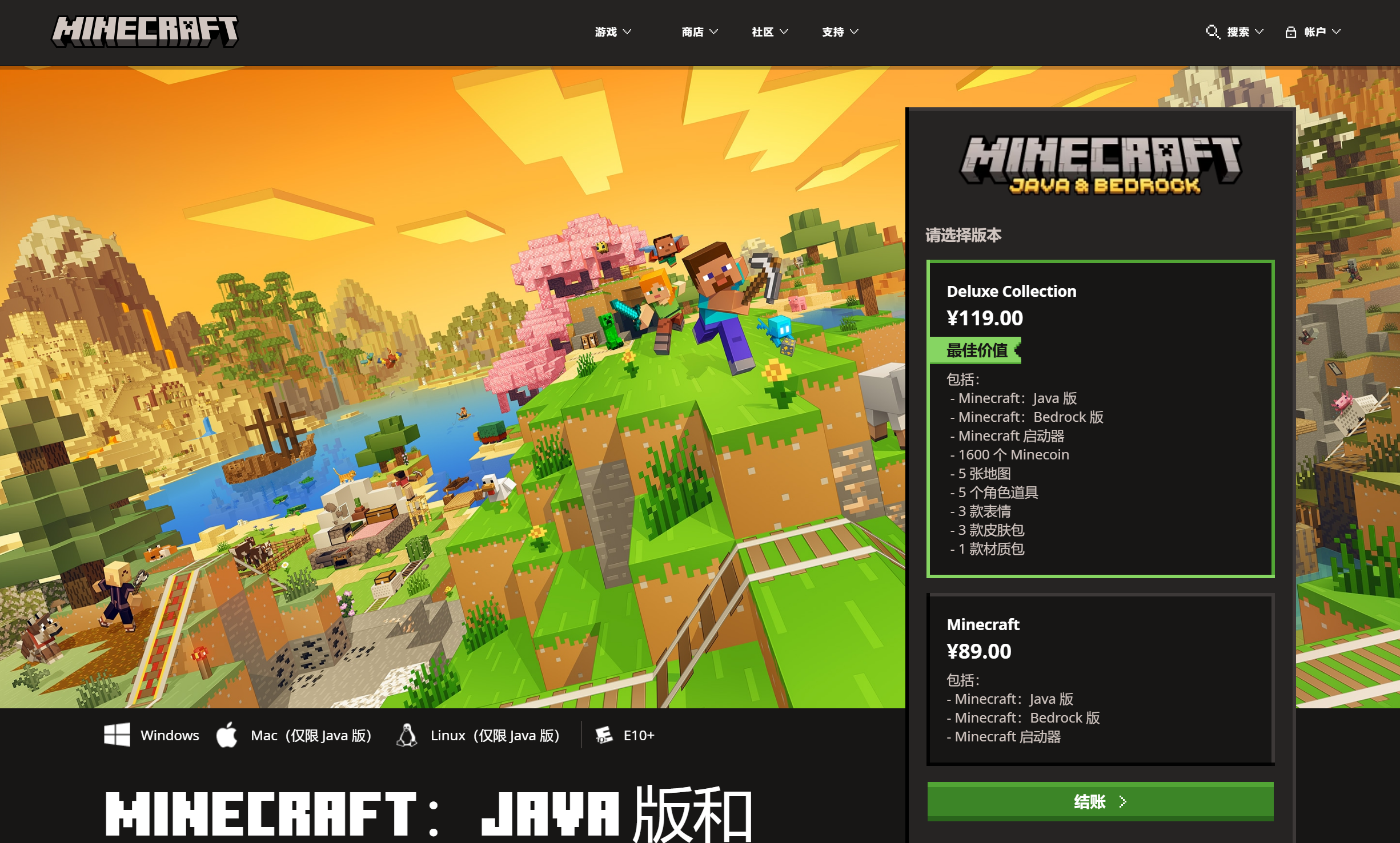 Java版是Minecraft的最初版本,发布于Windows, macOS和Linux. 这些平台共享一个Minecraft版本, 因此你只需要购买一次即可在三个平台上畅玩. 本购买指南共分为两部分, 官方网站购买和微软商店购买, 你可以自由的选择你想要的方式进行购买, 订单会在两个平台间同步.