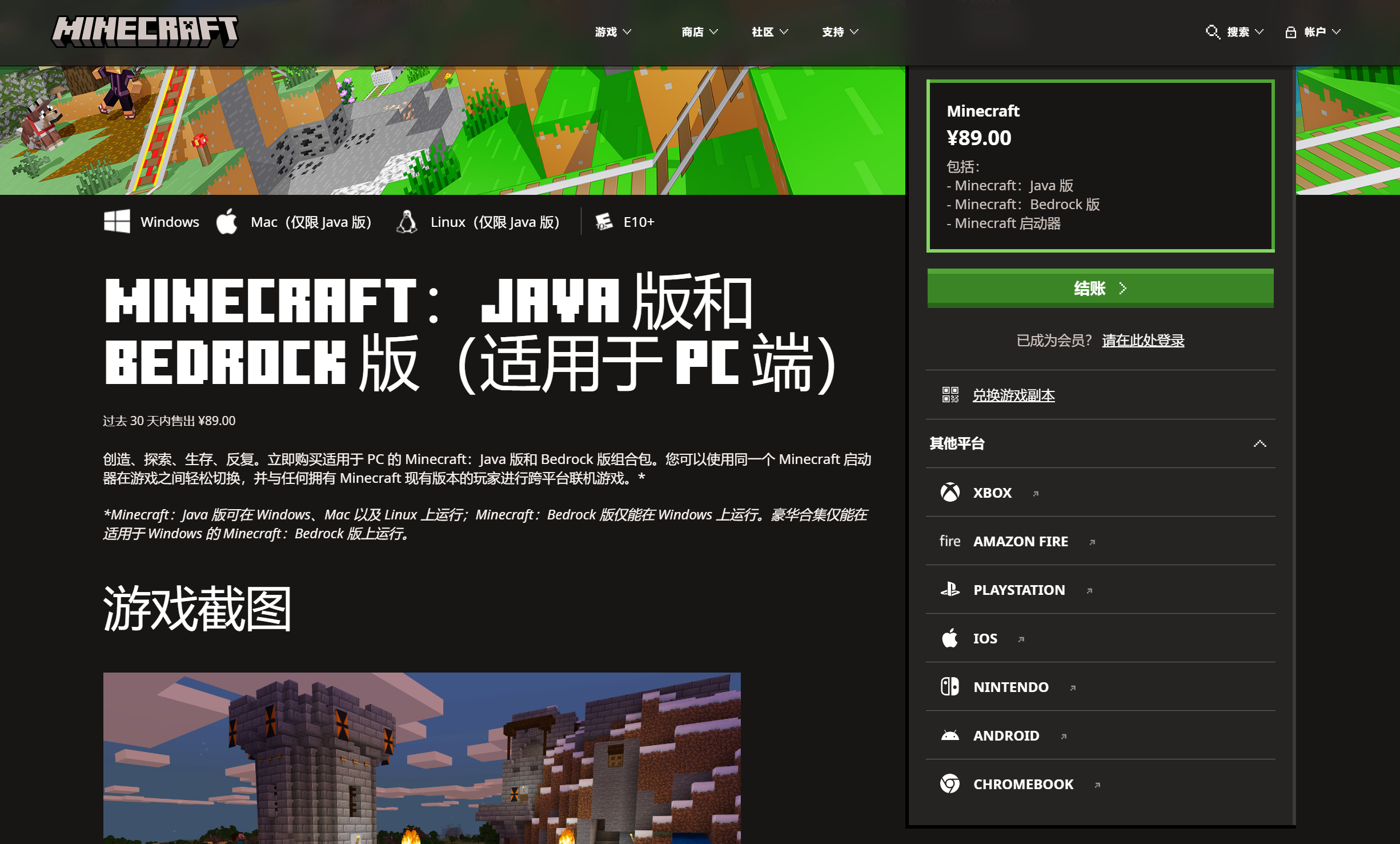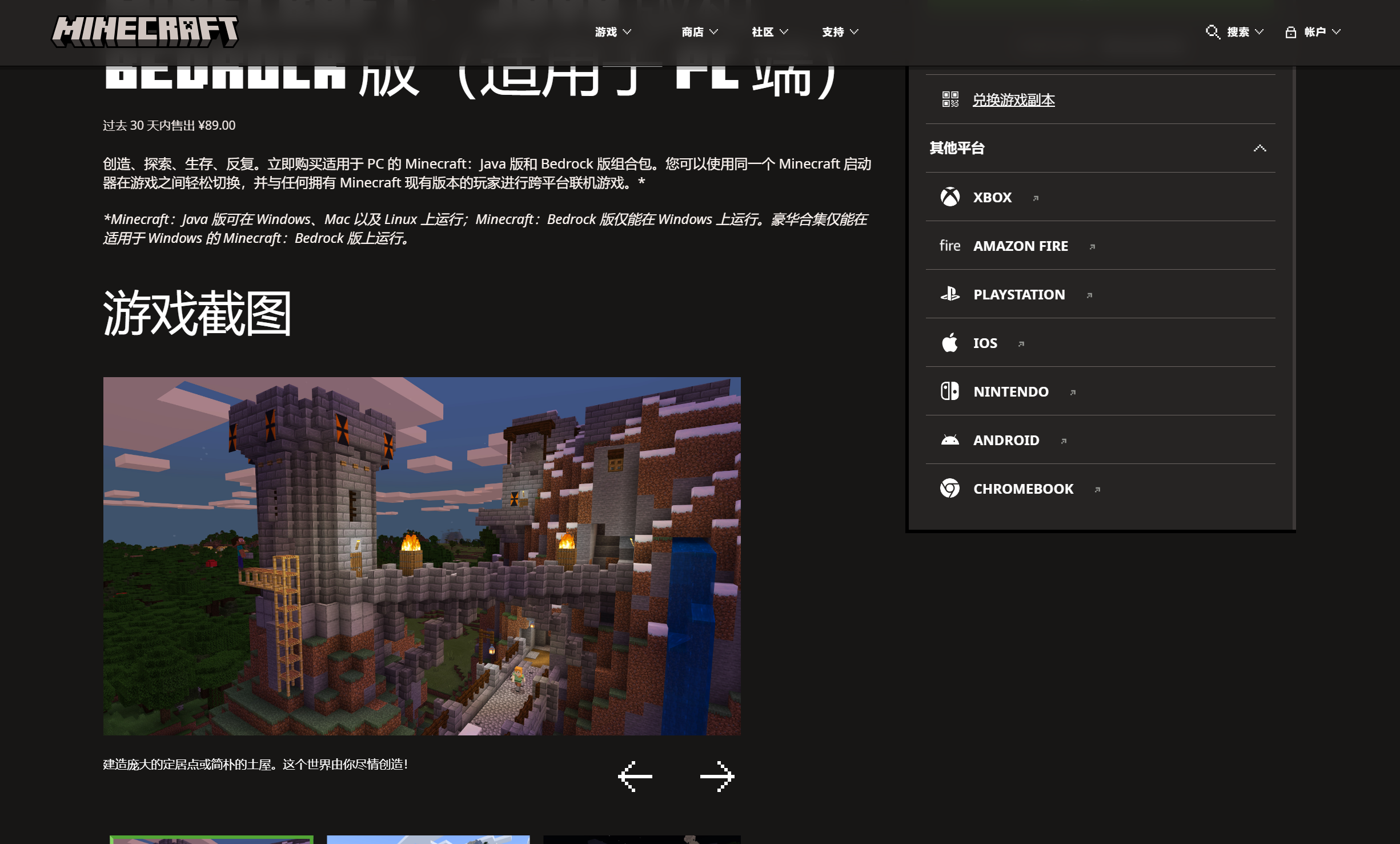 4. 在一般情况下, 推荐选择Minecraft(PC捆绑包), 包含Java版/基岩版/启动器, 售价¥89.00, 如图所示.