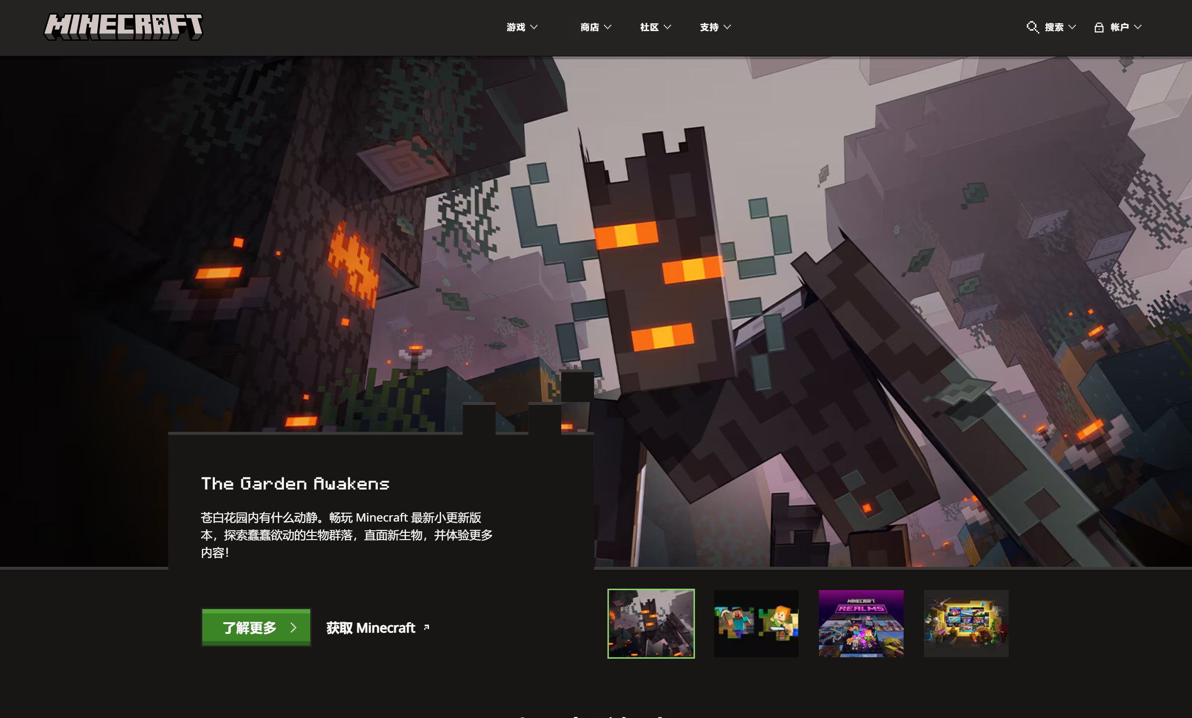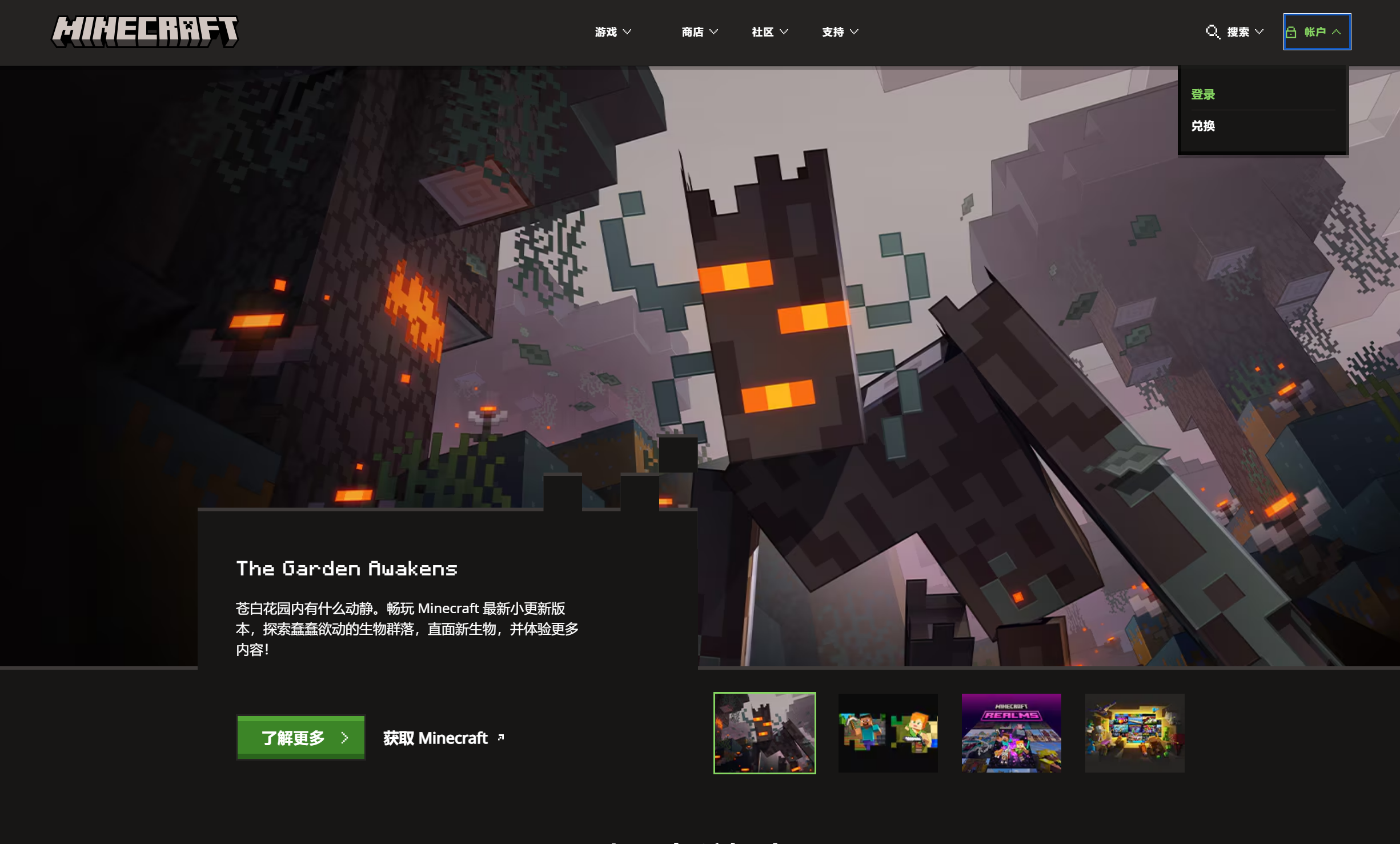 3. 登录成功后点击网页顶栏[游戏], 选择[Minecraft], 如图所示.